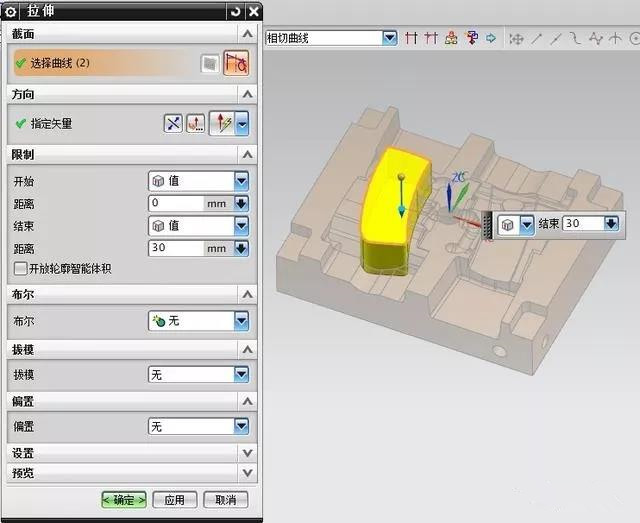 曲线相接起来后,用拉伸命令拉伸出最大外形,如下图: