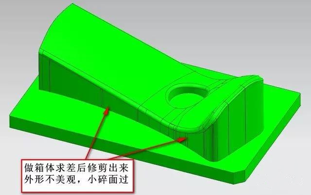 如上图所示,如果按常规做法,我们都是加箱体求差然后修剪掉多余部分,但这样做比较费时间以及效果不理想。遇到这种情况应该用逆推思维做法,用投影响曲线先找出最大外形,如下图: