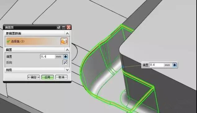 步骤三:选择拆分体把电极分割,取上面小部分,这样就去除了与下面部分的特征曲率,这个时候就可以偏置了(注意:偏置的参数不要过大),最后达到我们要的效果。